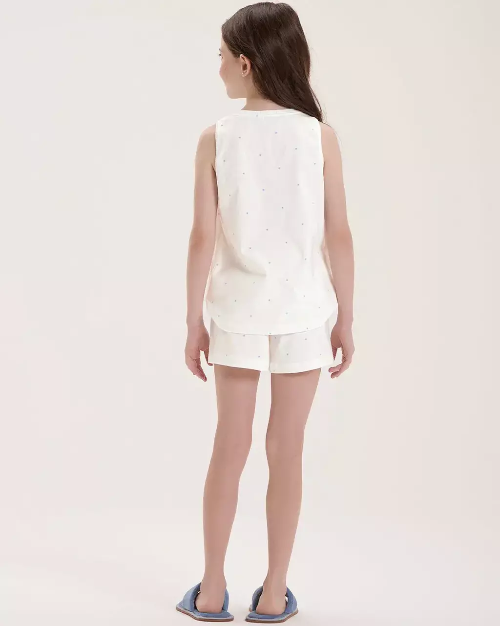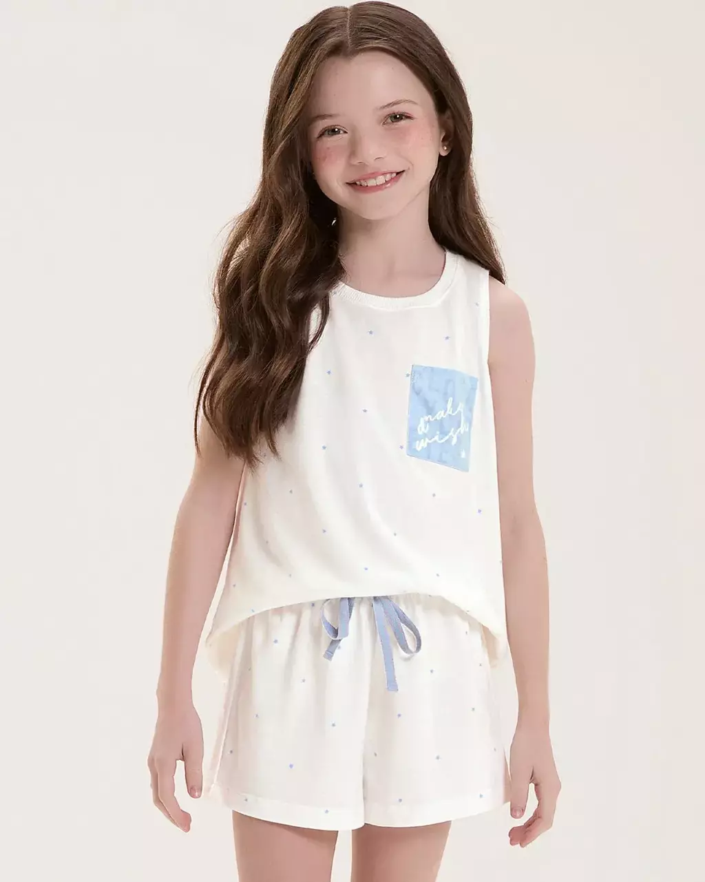 O Pijama Infantil Feminino Sonhos de Verão é a escolha perfeita para garantir noites de sono tranquilas e cheias de magia. Confeccionado em 100% algodão, o modelo traz uma regata com estampa rotativa de mini estrelas azuis, que encantam e despertam a imaginação das pequenas. No bolso, a frase “Make a Wish” (faça um pedido) aparece em estampa localizada, trazendo um toque lúdico e inspirador para os momentos de descanso.