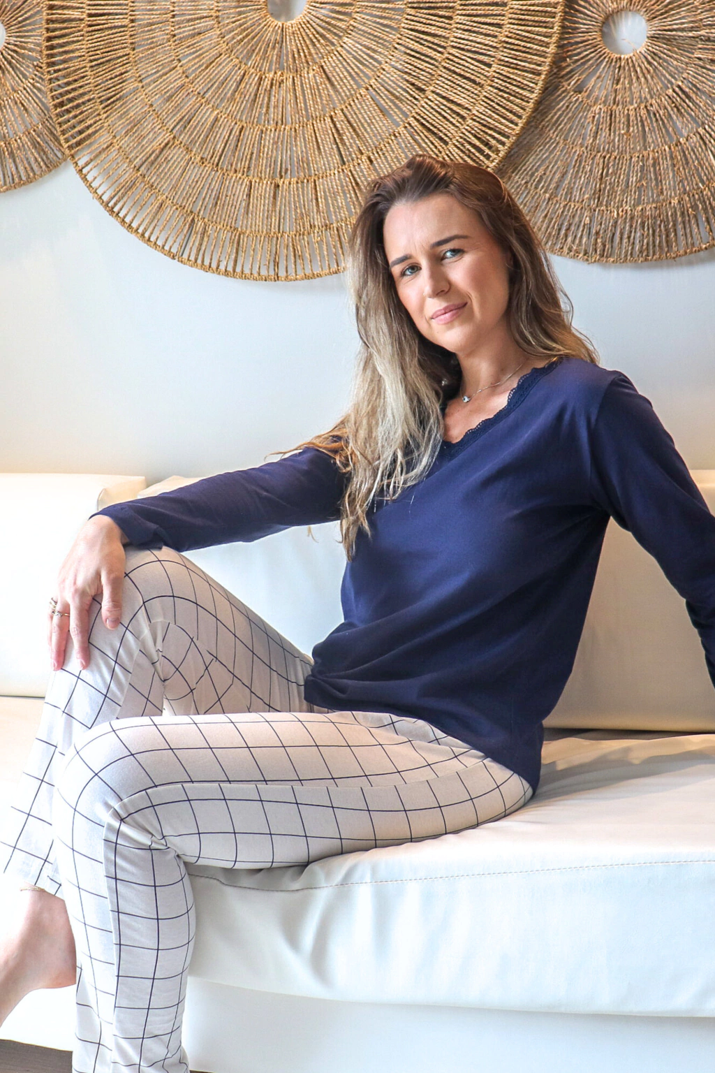 Feito em 100% algodão fio 30/1 penteado, proporciona um toque macio e respirável, perfeito para noites aconchegantes e momentos de relaxamento. A blusa de manga longa, com detalhe delicado em renda no decote, adiciona um toque de feminilidade e charme, enquanto a calça listrada em azul e branco segue a tendência clássica do Xadrez, trazendo elegância ao conjunto.