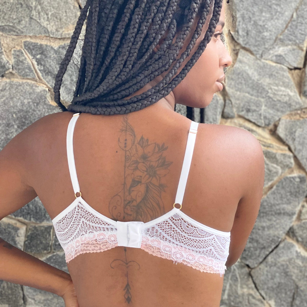 Sutiã modelo cobertura total de renda com sobreposição de cores.